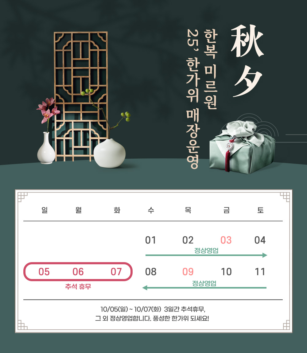 10월 05일(일) - 10월 07일(화) 휴무입니다.